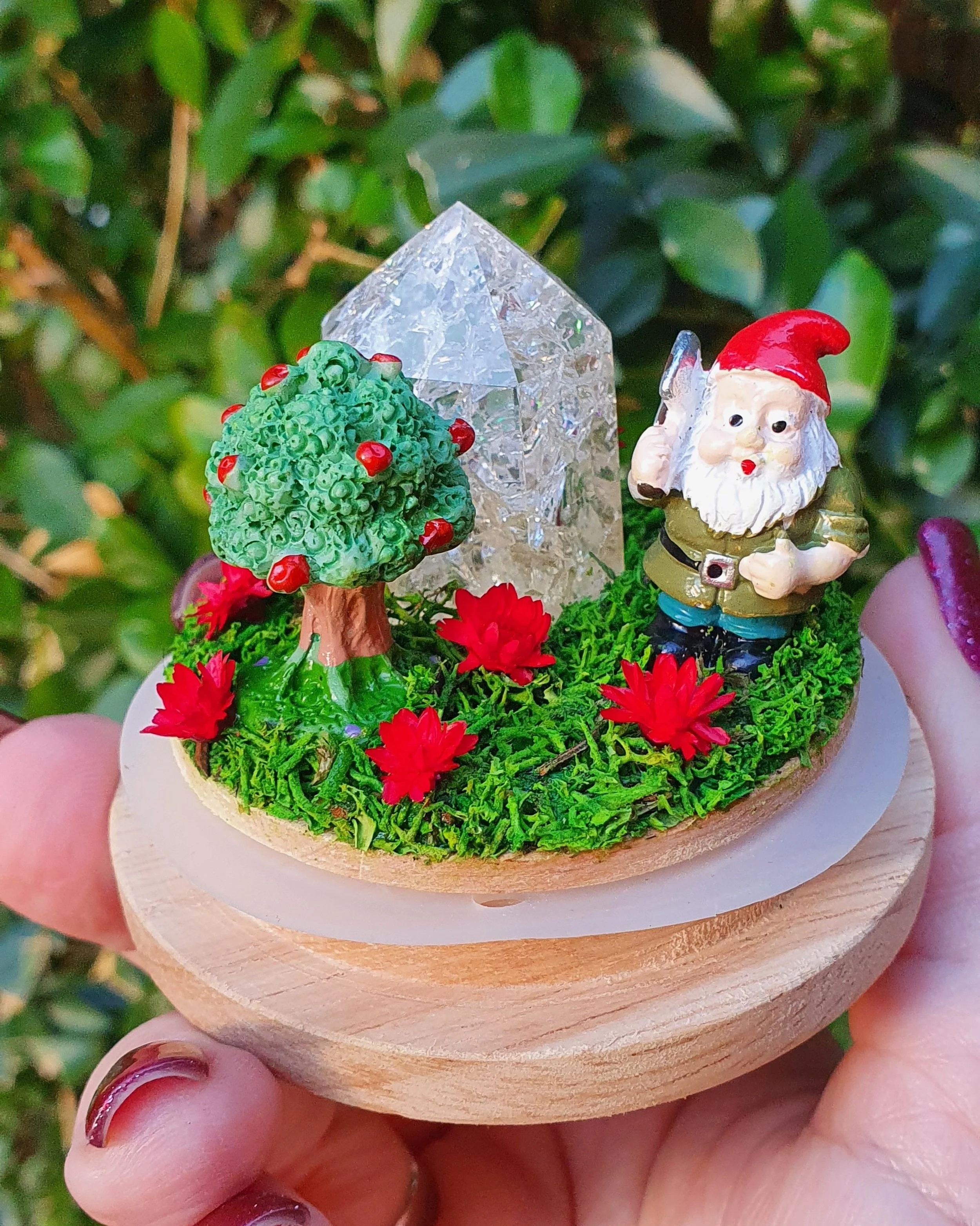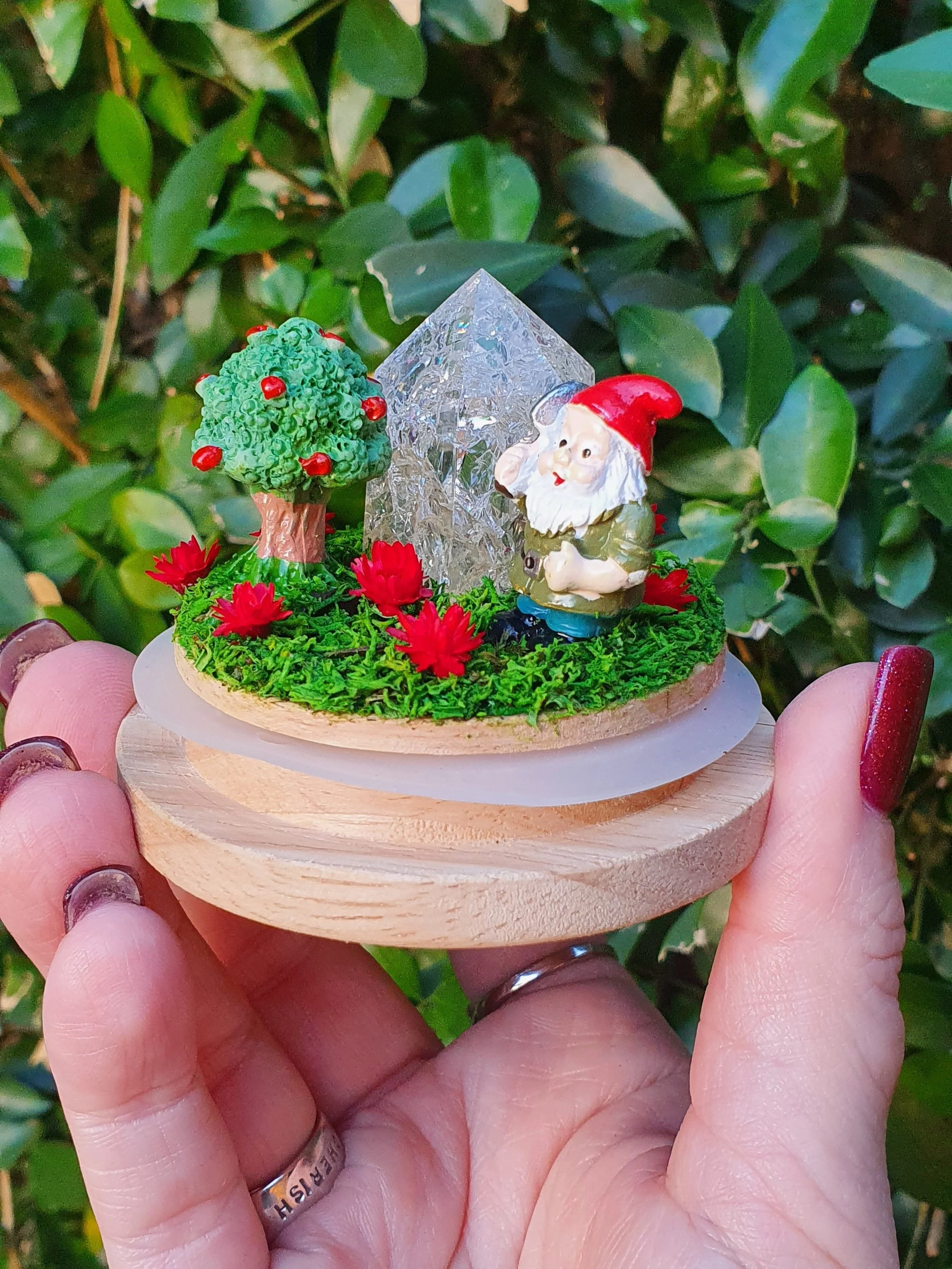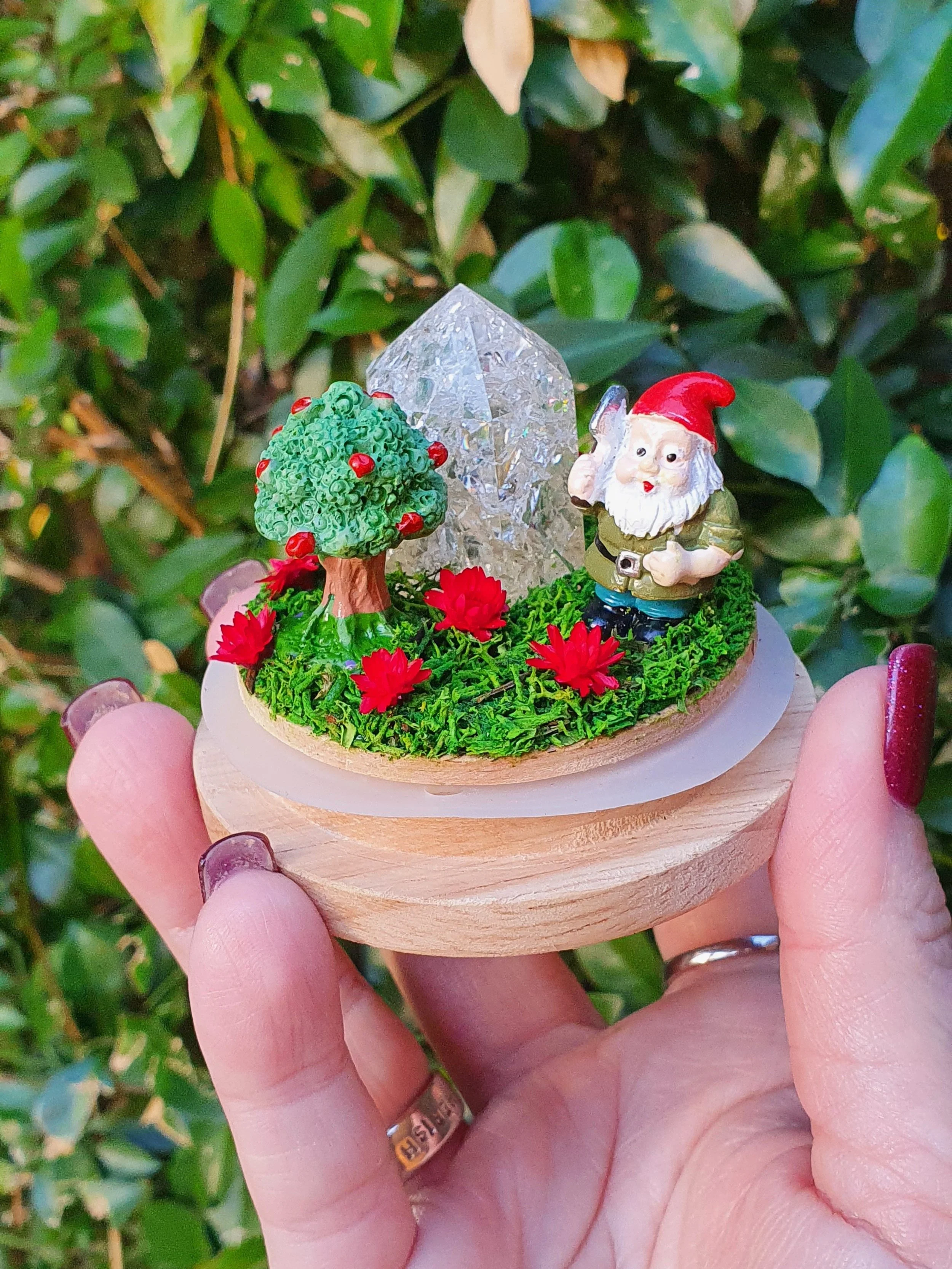 This cute gnome guy is paired together with a beautiful Crackled Quartz tower, cute mini cherry tree figurine and finished with preserved moss and dried flowers. Best of all you can remove the dome when needed.