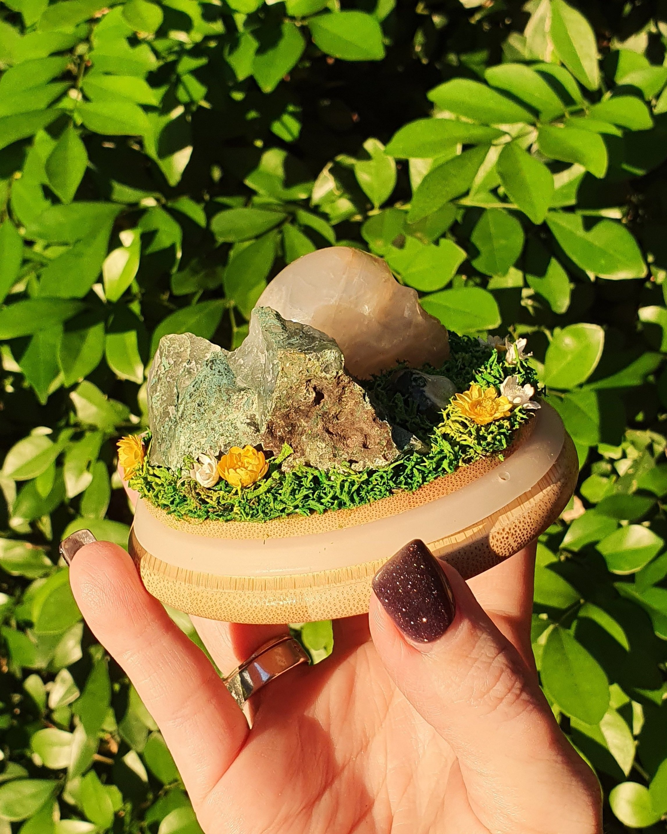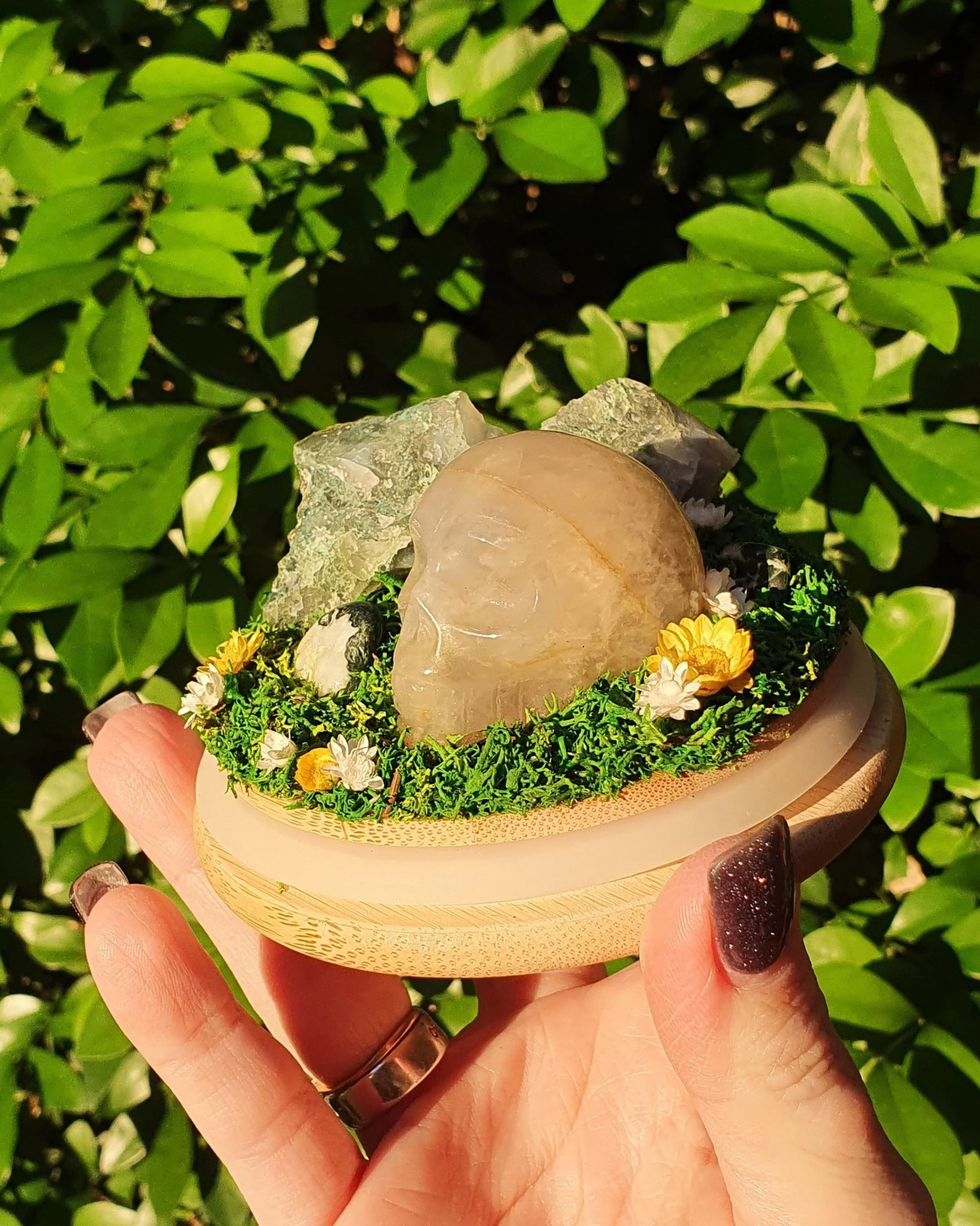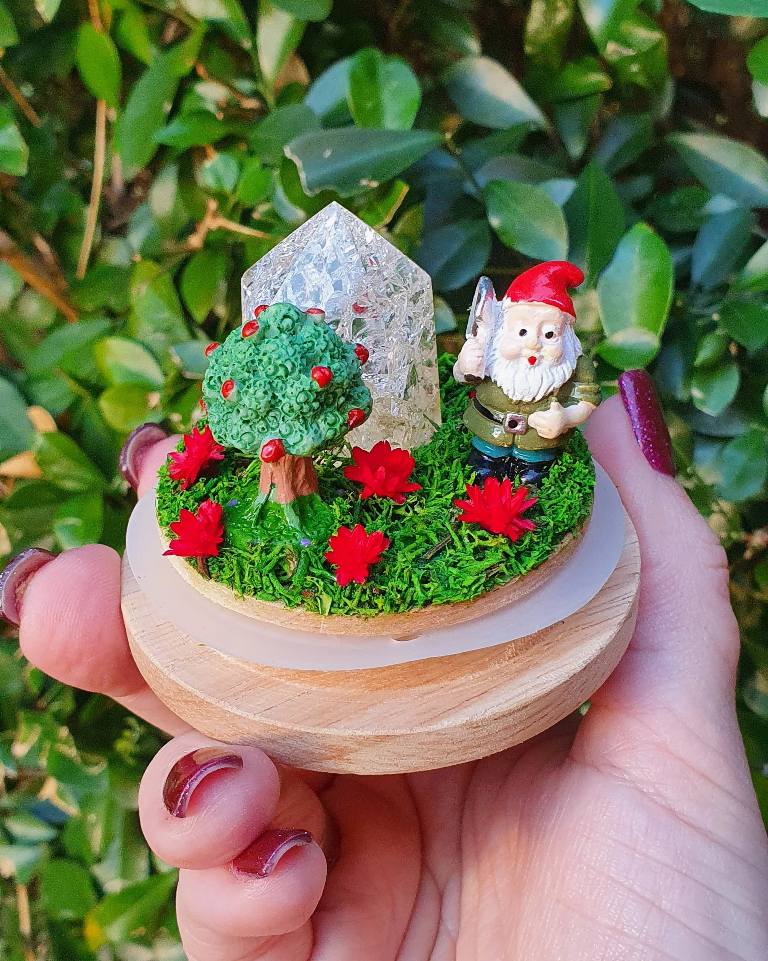 This cute gnome guy is paired together with a beautiful Crackled Quartz tower, cute mini cherry tree figurine and finished with preserved moss and dried flowers. Best of all you can remove the dome when needed.
