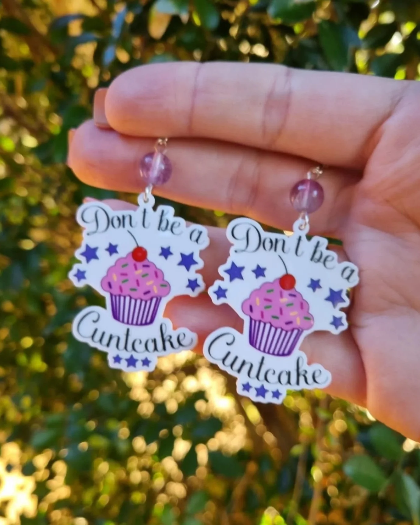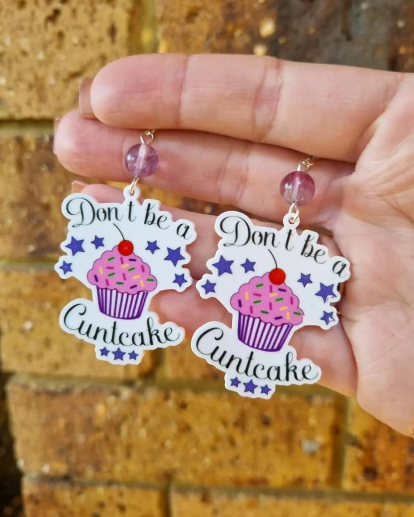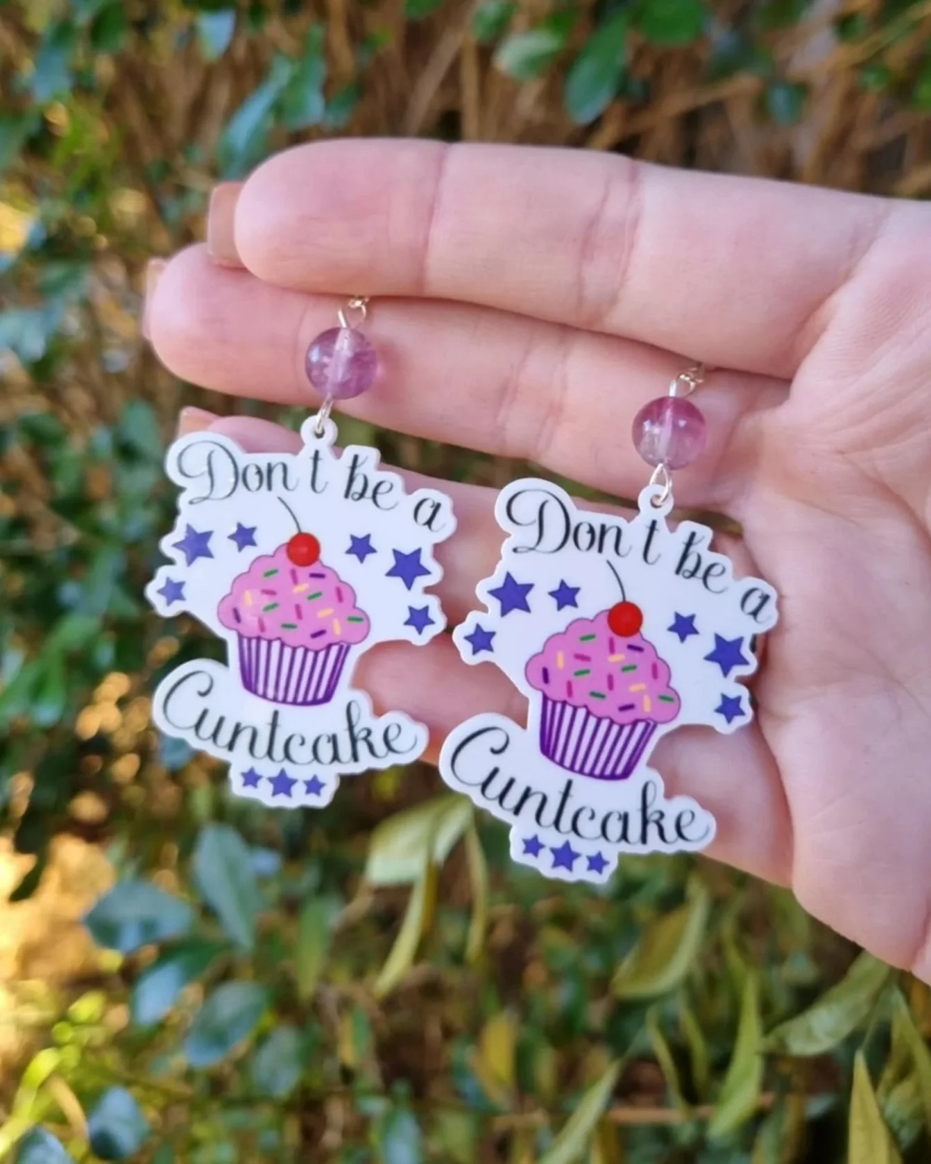 These super cute Fluroite "Don't Be a Cuntcake" Earrings are wrapped with silver tarnish resistant wire finished with a funny quote Charm. Perfect addition to jewellery box or daily wear with any outfit.