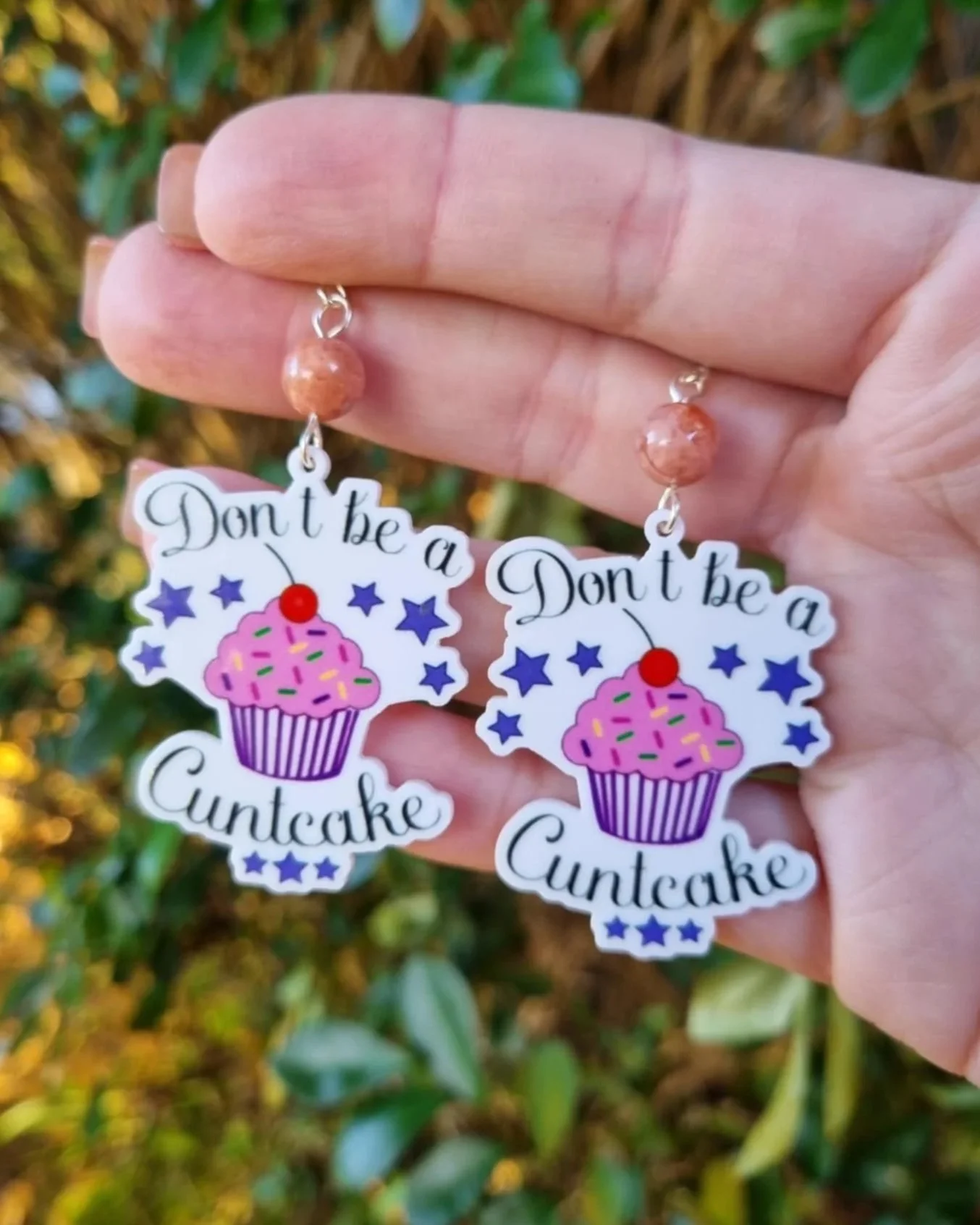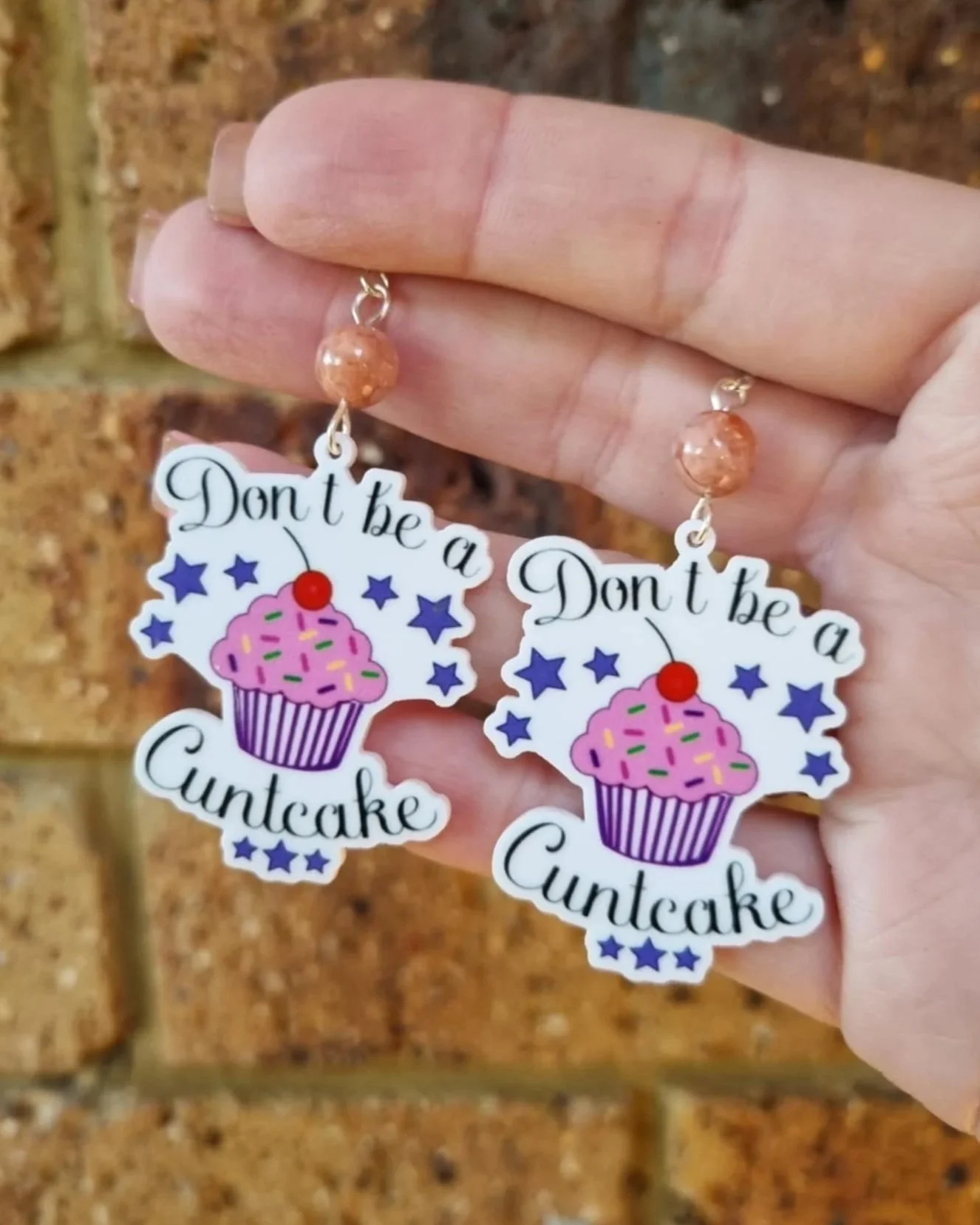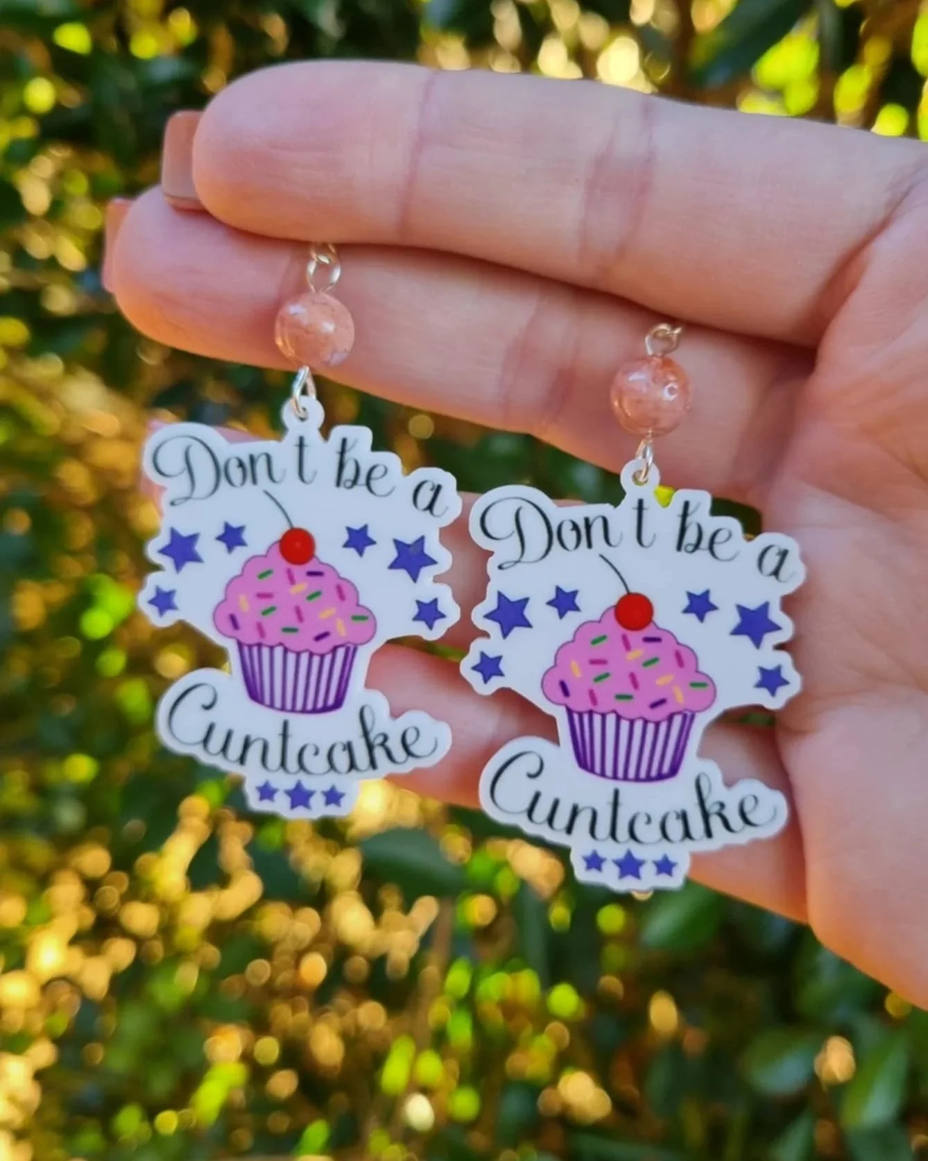 These super cute Pink Cotton Candy Agate "F-Bomb" Earrings are wrapped with gold tarnish resistant wire finished with a funny quote Charm. Perfect addition to jewellery box or daily wear with any outfit.